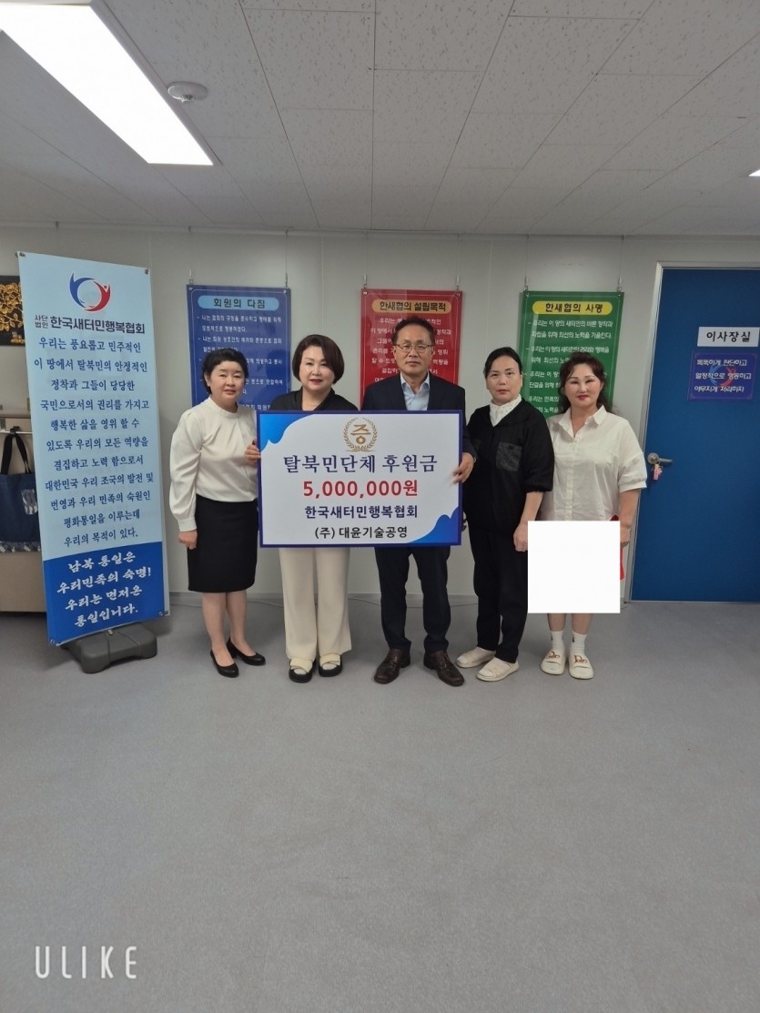 (주)대윤기술공영/ (사)한국새터민행복협회 후원금 전달식 페이지 정보 작성자 관리자 조회 15회 작성일 25-10-15 14:52 목록 본문 (주)대윤기술공영 / (사)한국새터민행복협회 후원금 전달식 진행